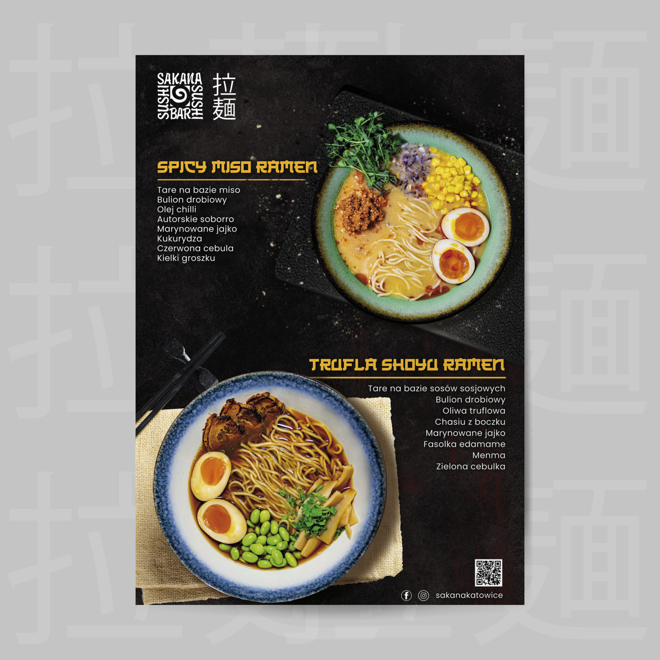 PLAKAT PROMUJĄCY OFERTĘ RAMENÓW W RESTAURACJI JAPOŃSKIEJ SAKANA SUSHI
