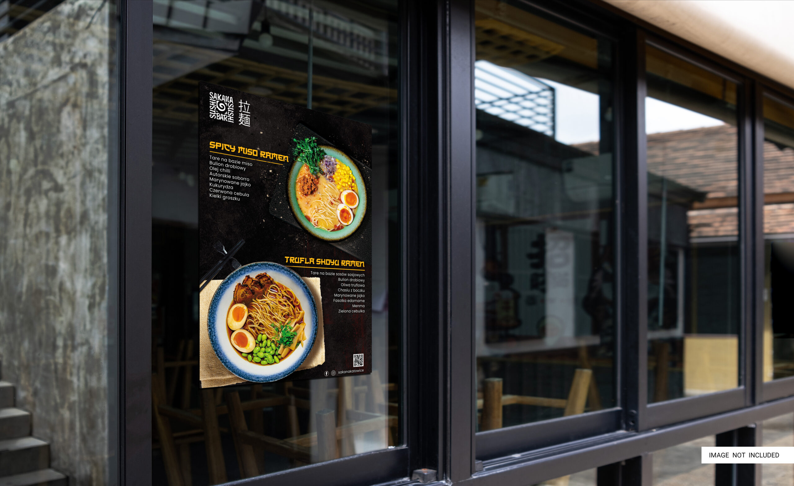 Graficznie, plakat emanuje smakiem i aromatem ramenów. Dodatkowo, umiejętne ułożenie elementów wizualnych podkreśla zarówno różnorodność oferty ramenów, jak i unikalny styl kulinarny Sakana Sushi. Grafika na plakacie oddaje atmosferę japońskiej restauracji, co przyciąga uwagę koneserów kuchni azjatyckiej.