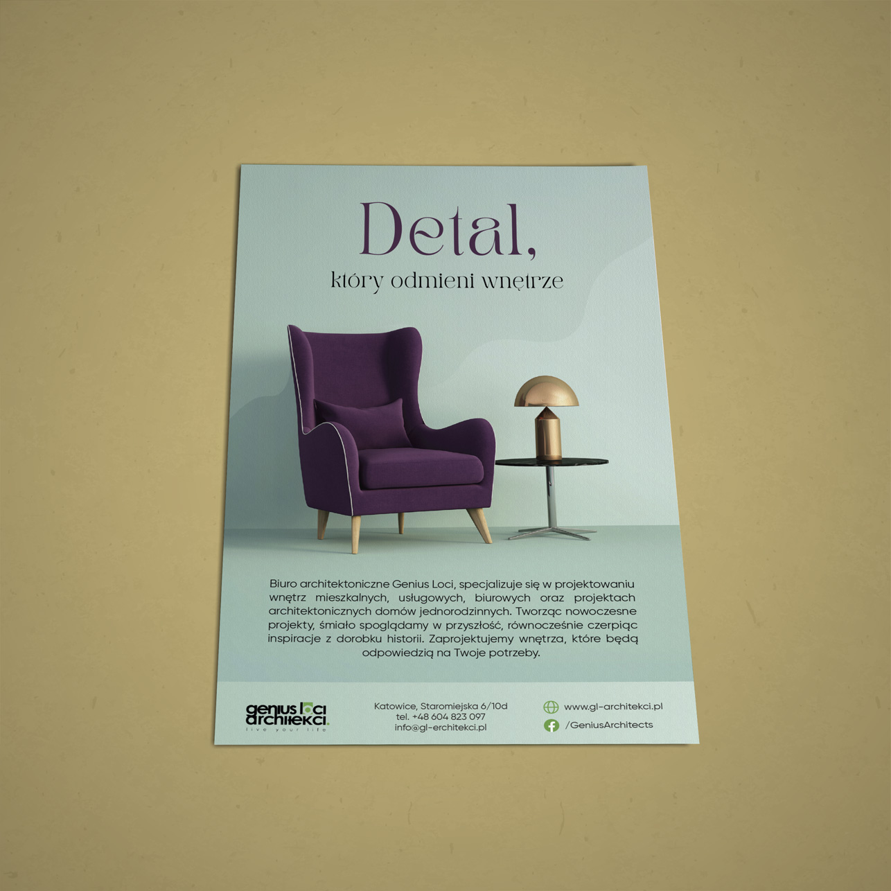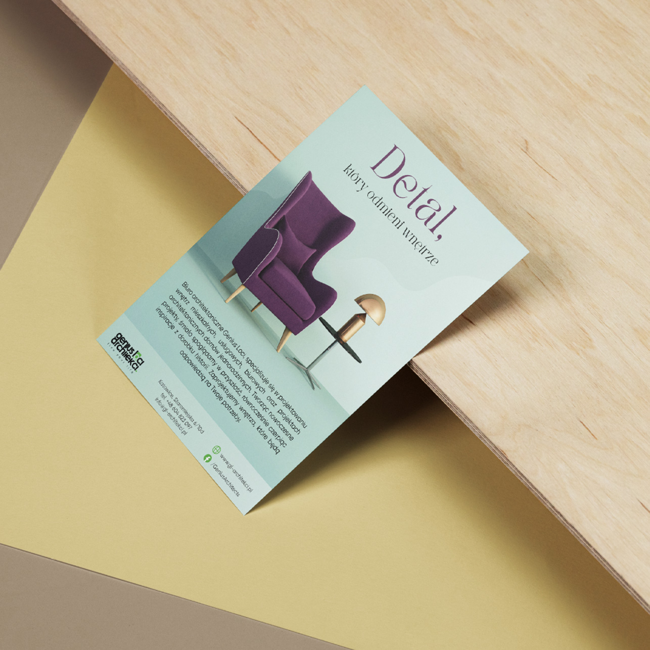 Przedstawiam projekt ulotki dla studia architektonicznego, który stanowił część zadania rekrutacyjnego. Wykorzystując dostarczony mi element – fotel oraz tekst udało mi się zaprojektować coś wyjątkowego. Kolorystyka została starannie dobrana, co sprawia, że ulotka jest nie tylko atrakcyjna wizualnie, ale również spójna i klasyczna, oddając elegancję marki.