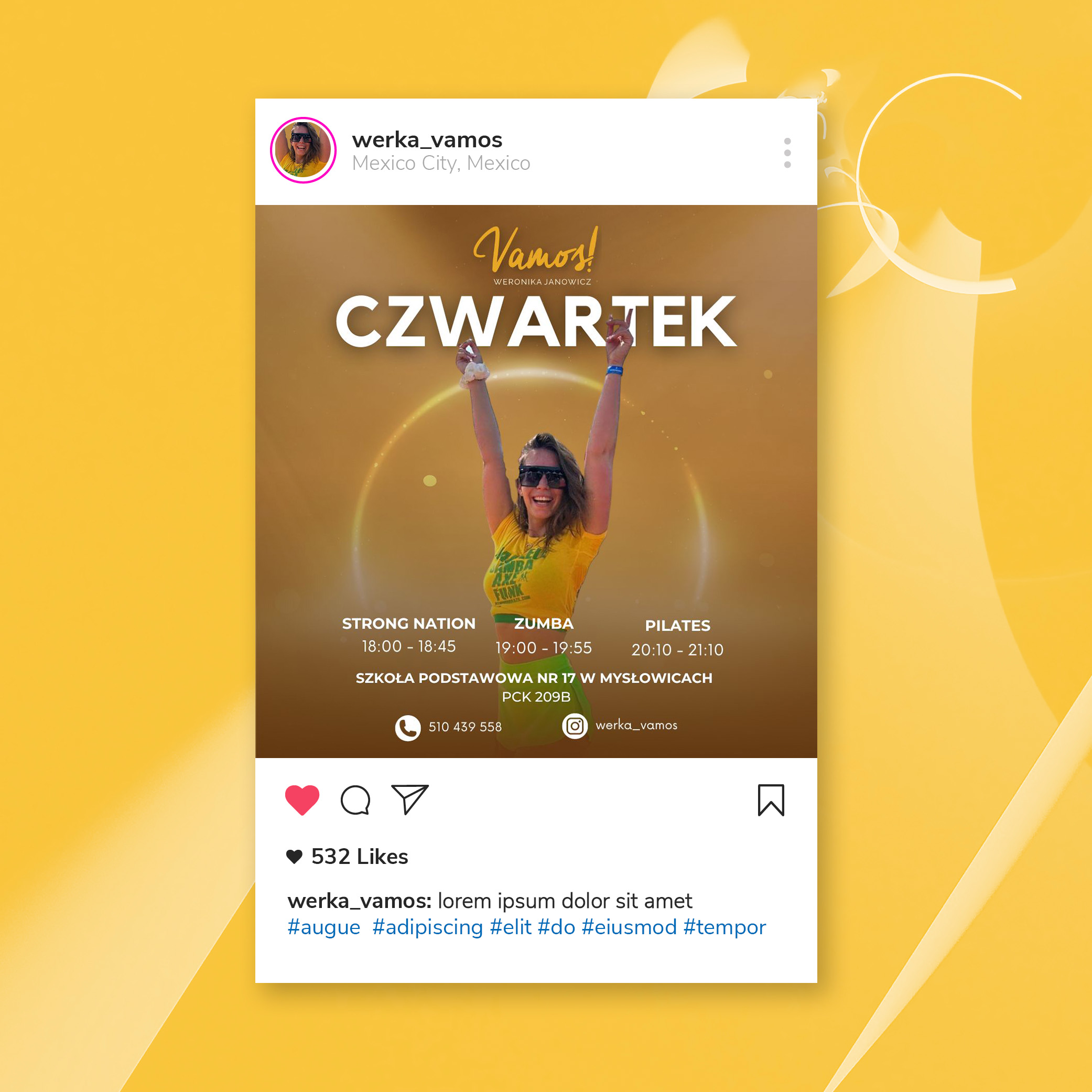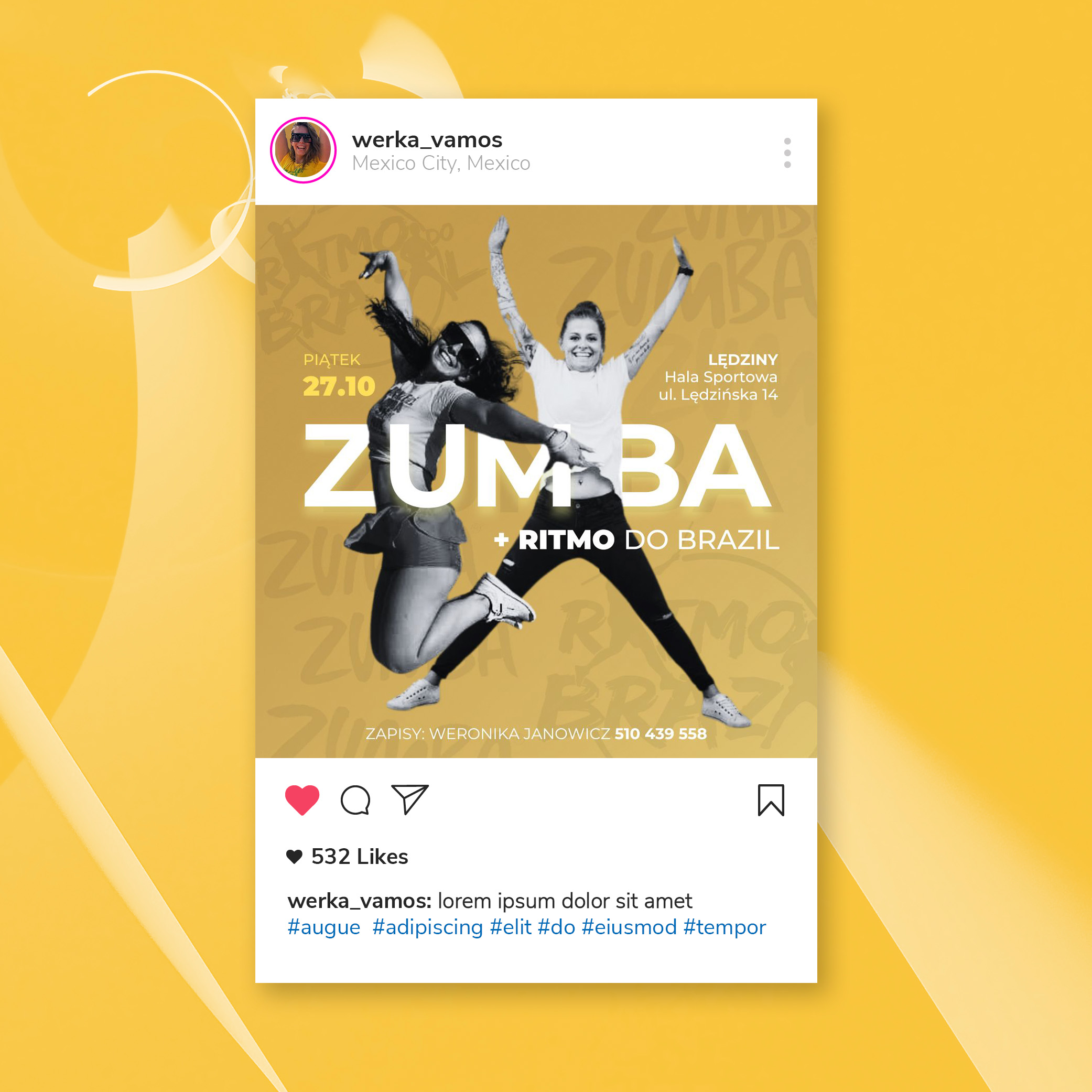 Z przyjemnością przedstawiam posty, które zaprojektowałam we współpracy z marką Weroniki Janowicz – Vamos. Weronika jest utalentowaną tancerką i prowadzi własne zajęcia taneczne. Wspólnie stworzyłyśmy trzy posty promujące różne eventy, które oferuje.